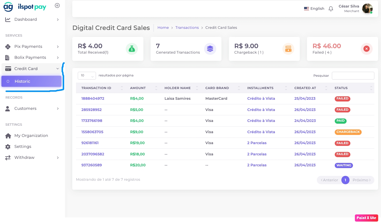 The second card informs about the Generated Transactions, which is the quantity in units of initiated transactions, including those awaiting payment, paid, refunded, among others.